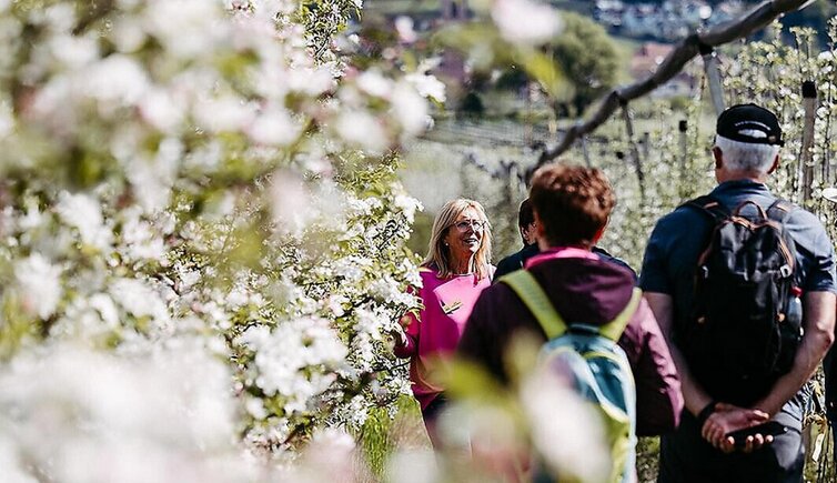 Wir spazieren zwischen den blühenden Apfelbäumen, umgeben von Tausenden von rosa-weißen Blüten. Wir riechen deren Duft und fühlen die Sanftheit des Frühlings.