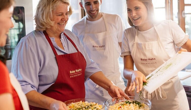 Die Teilnehmerinnen und Teilnehmer erwartet ein 4-Gänge-Menü aus lokalen Zutaten von Südtirols Bauernhöfen. Erfahrene Küchenprofis, vertraut mit Südtiroler Speisen, begleiten sie Dich durch einen kulinarischen bäuerlichen Abend und geben Dir neue Inspirationen für (un)bekannte Gerichte. Spannende Tipps und Tricks erwarten Dich in der Küche der Kochschule. Dabei kannst Du nicht nur selbst Hand anlegen, sondern während des Abends die gekochten Gerichte auch genießen. Gemeinsam am großen Tisch, der „tavolata“, werden die selbst zubereiteten Speisen mit passender Weinbegleitung anschließend zum Mittelpunkt des Abends.