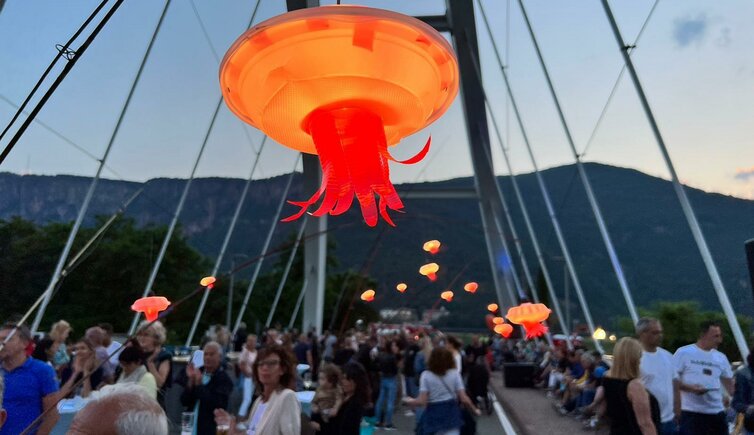 Die Pfattner Brücke verbindet im Alltag, doch an diesem Abend wird sie selbst zum Schauplatz. Für das Light+Food+Music Festival wird die Straße gesperrt und die moderne und avantgardistische Konstruktion verwandelt sich in eine Bühne. Die Brücke wird mit Lichtinstallationen in Szene gesetzt, die das Wasser der Etsch spiegeln und das Bauwerk in sanfte Farbtöne tauchen. Musikerinnen und Musiker untermalen die Illuminationen, sodass die Brücke zu einem Gesamtkunstwerk aus Licht, Klang und Bewegung wird.
