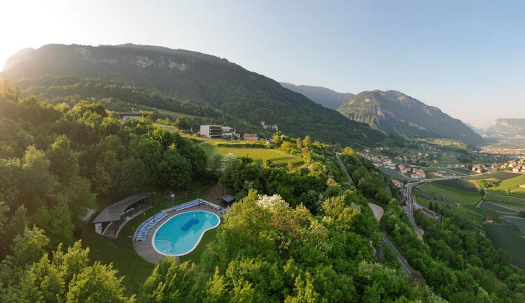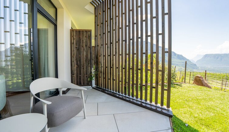 Die Zimmer und Suiten bieten einen herrlichen Ausblick auf das Südtiroler Unterland mit seinen Weinhängen, den Flusslauf der Etsch und den Kalterer See.