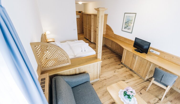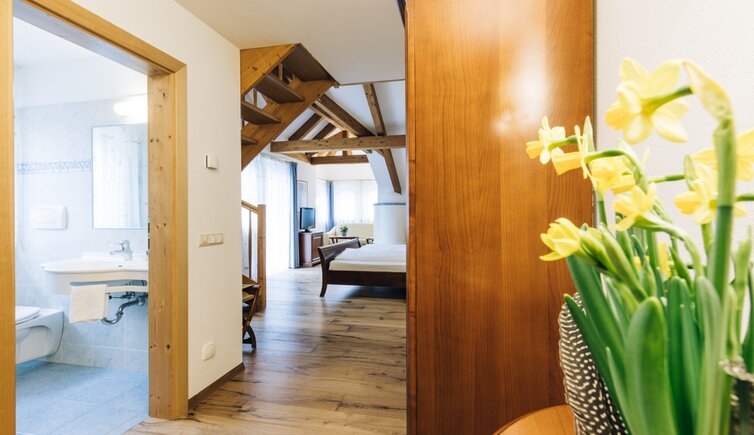Einige Zimmer sind nach Aussichtspunkten benannt, wie die “Salurner Klause” oder die “Schloss-Suite” mit Blick auf das Schloss Enn.