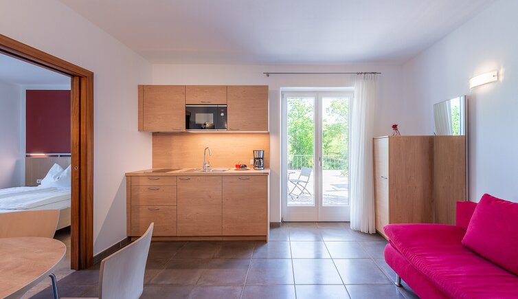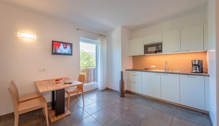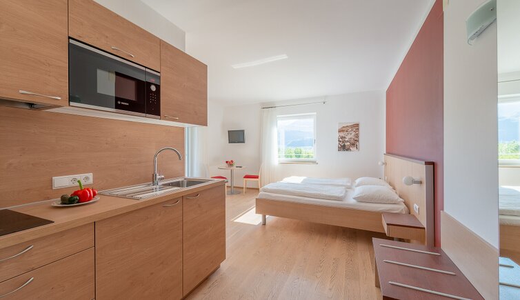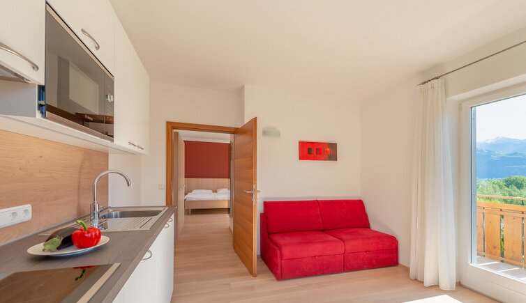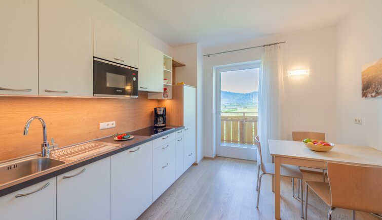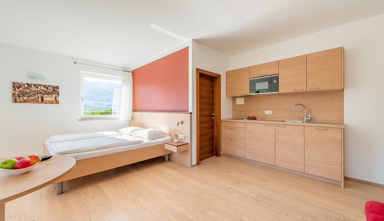 Wohnen Sie in komfortablen, voll ausgestatteten Ferienwohnungen, mit großer Terrasse oder Balkon mit Panoramablick auf den südlichen Teil der Dolomiten.