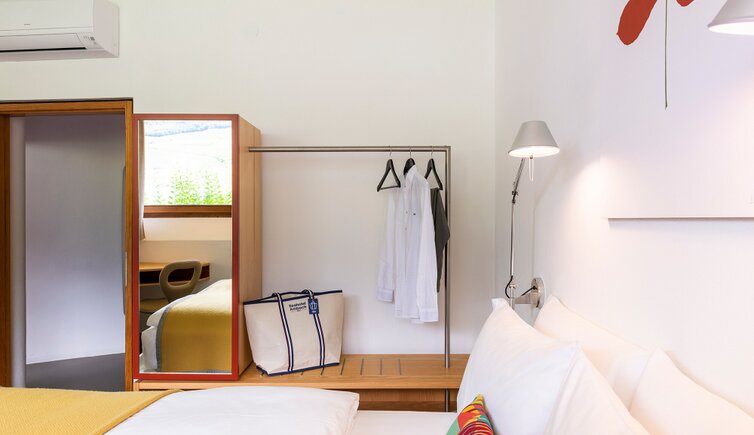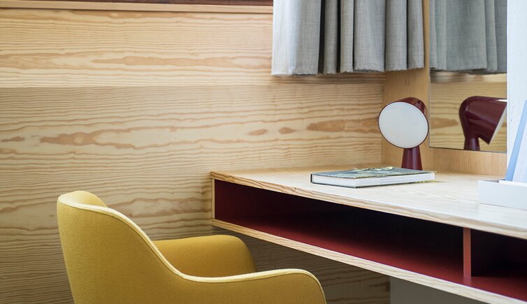 The structure of the hotel reminds of a ship in the harbour, embedded in the natural landscape. The exterior is reflected inside in form and colour: the water and shore world, the tree landscape and the vineyards.