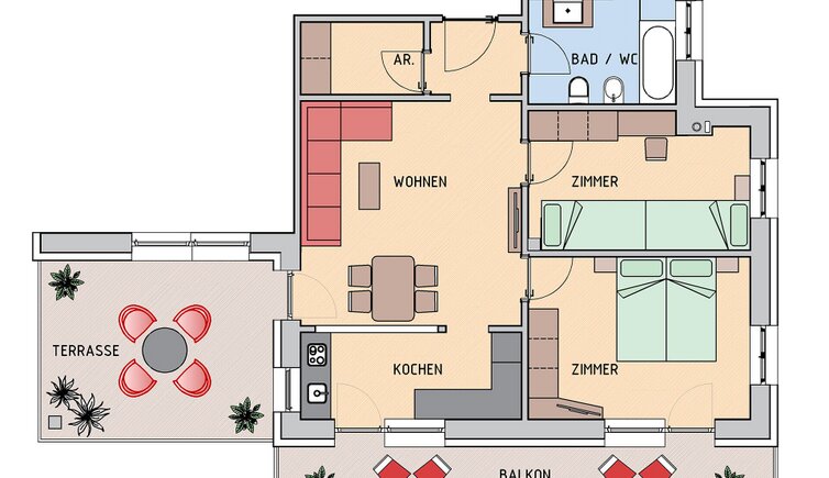 Vi aspettano due appartamenti vacanza completamente nuovi, arredati con mobili in legno di pino massiccio locale.