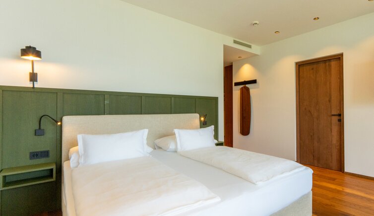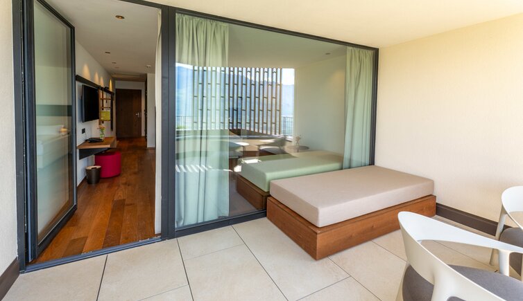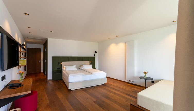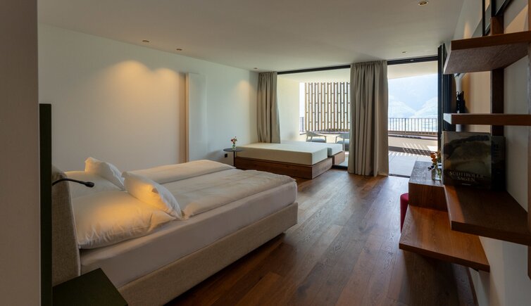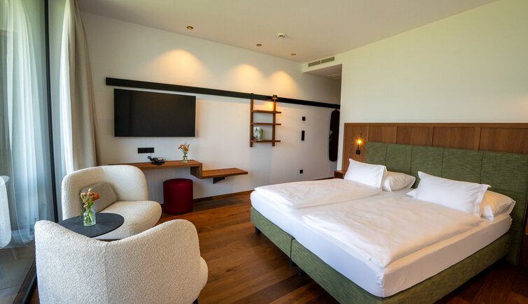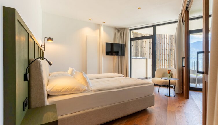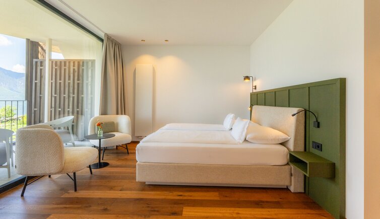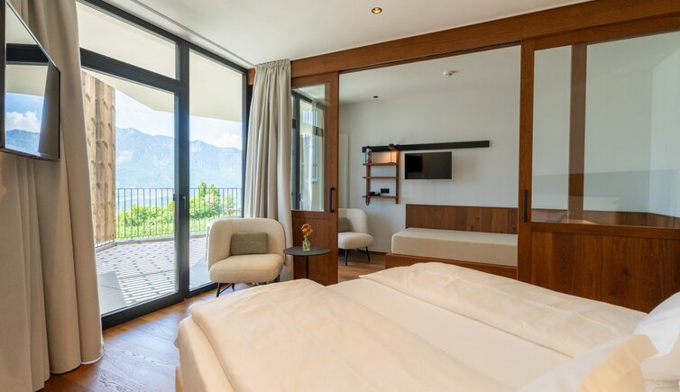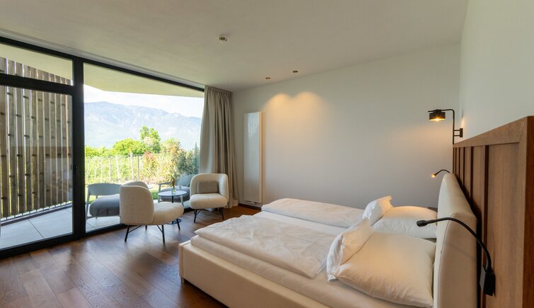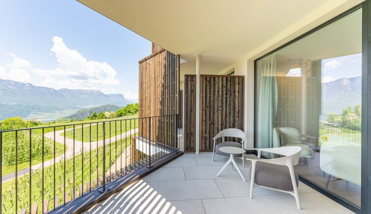 Le camere e suite offrono una vista stupenda sulla Bassa Atesina, con i suoi vigneti, lo scorrere dell’Adige e il Lago di Caldaro.